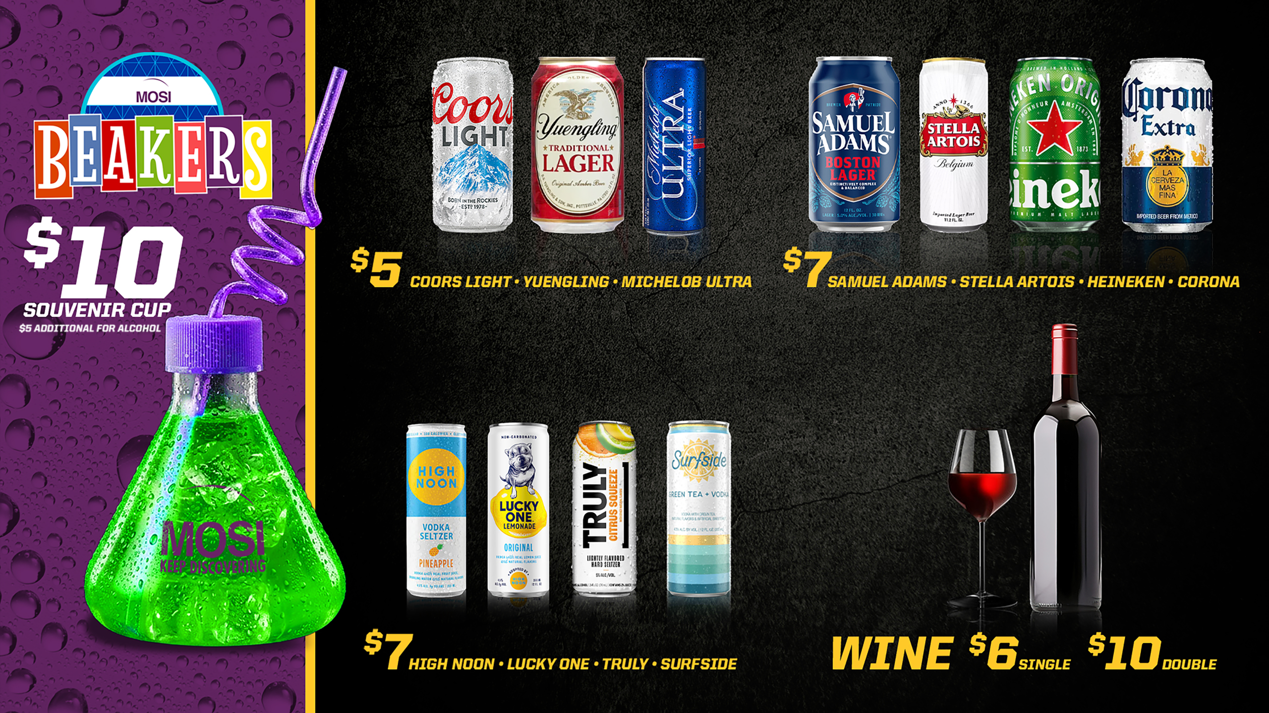 You can also visit the MOSI Marketplace for a selection of quick snack options and Beakers Bar for a variety of handcrafted cocktails and mocktails!